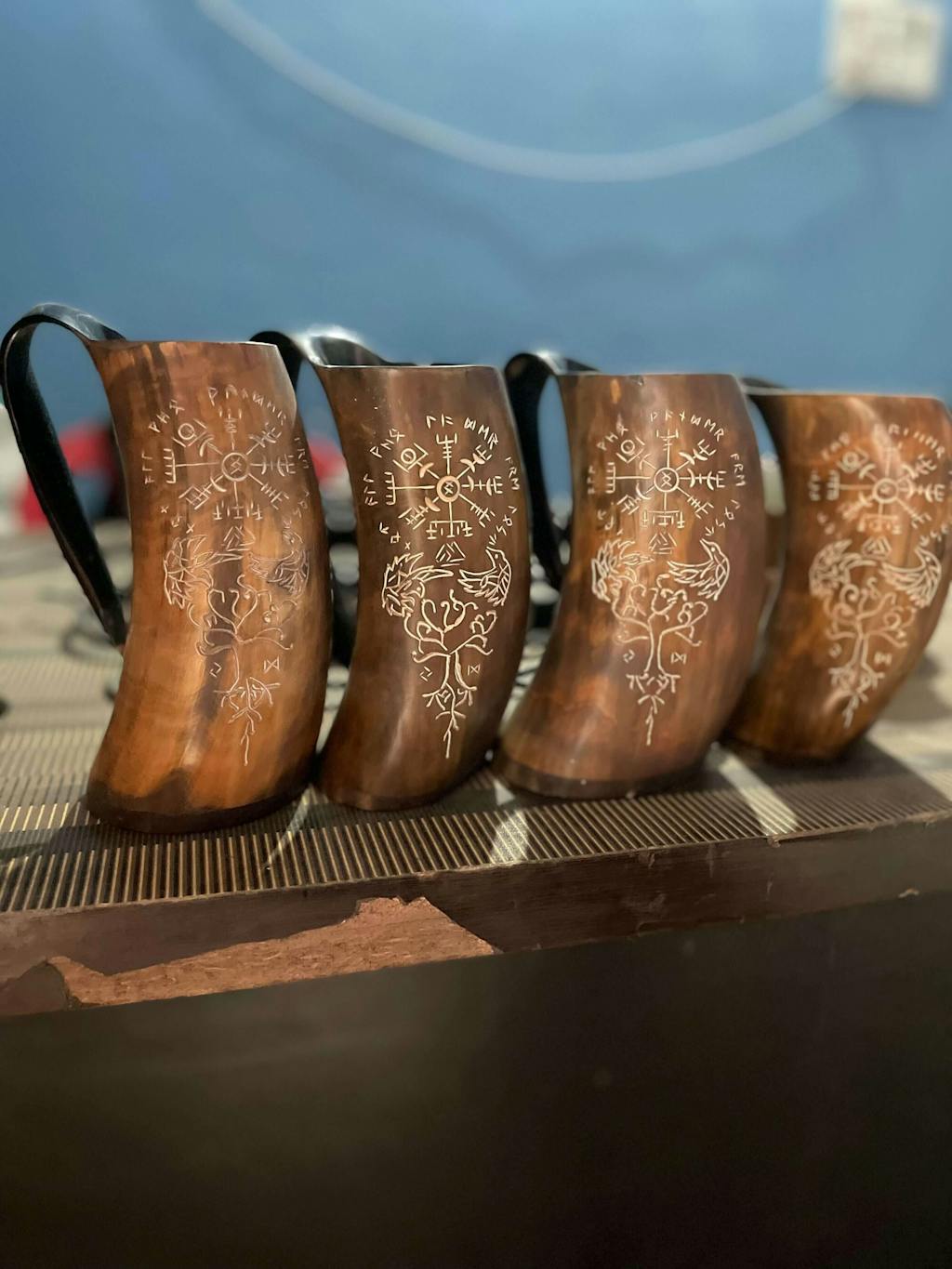 Burnt Horn Mug with Carved Norse Symbols