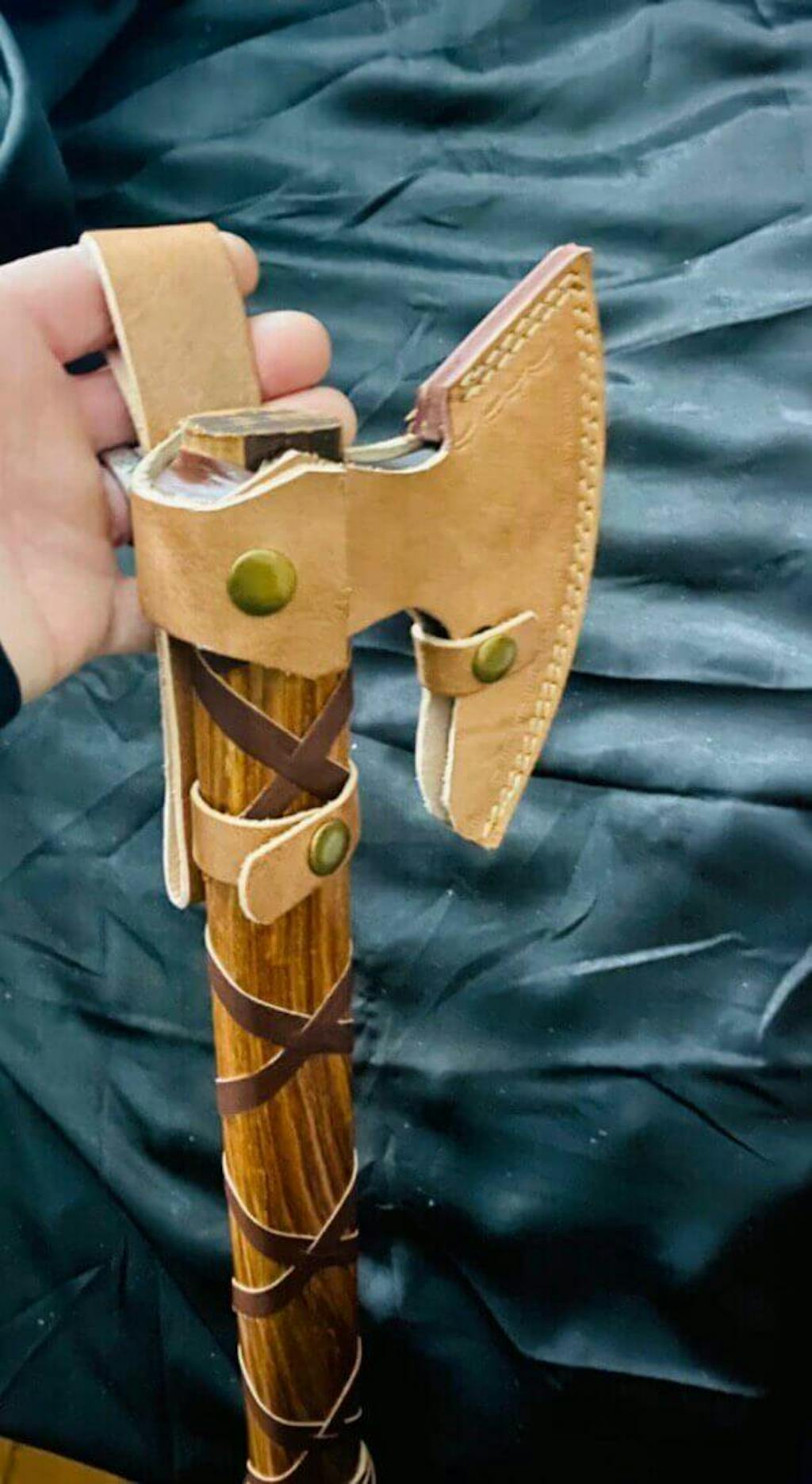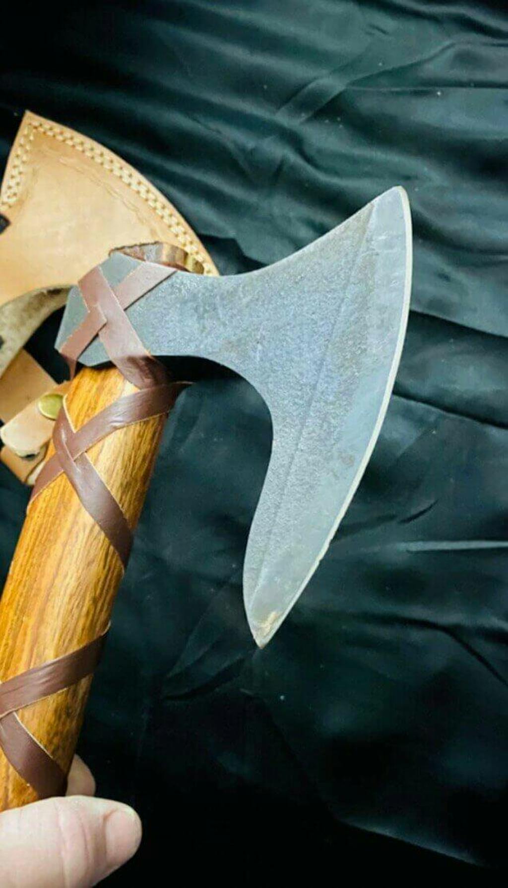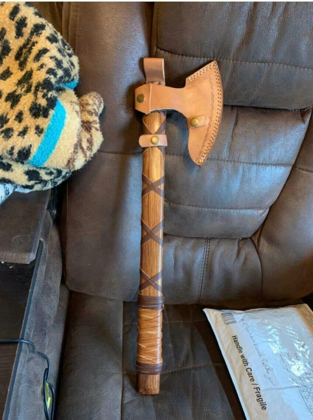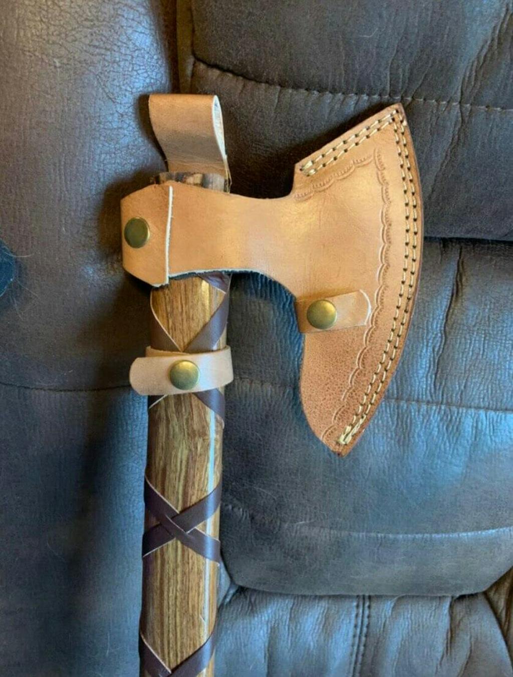When not used, protect the head (and prevent injury) with the handmade leather sheath that comes with the axe for free.